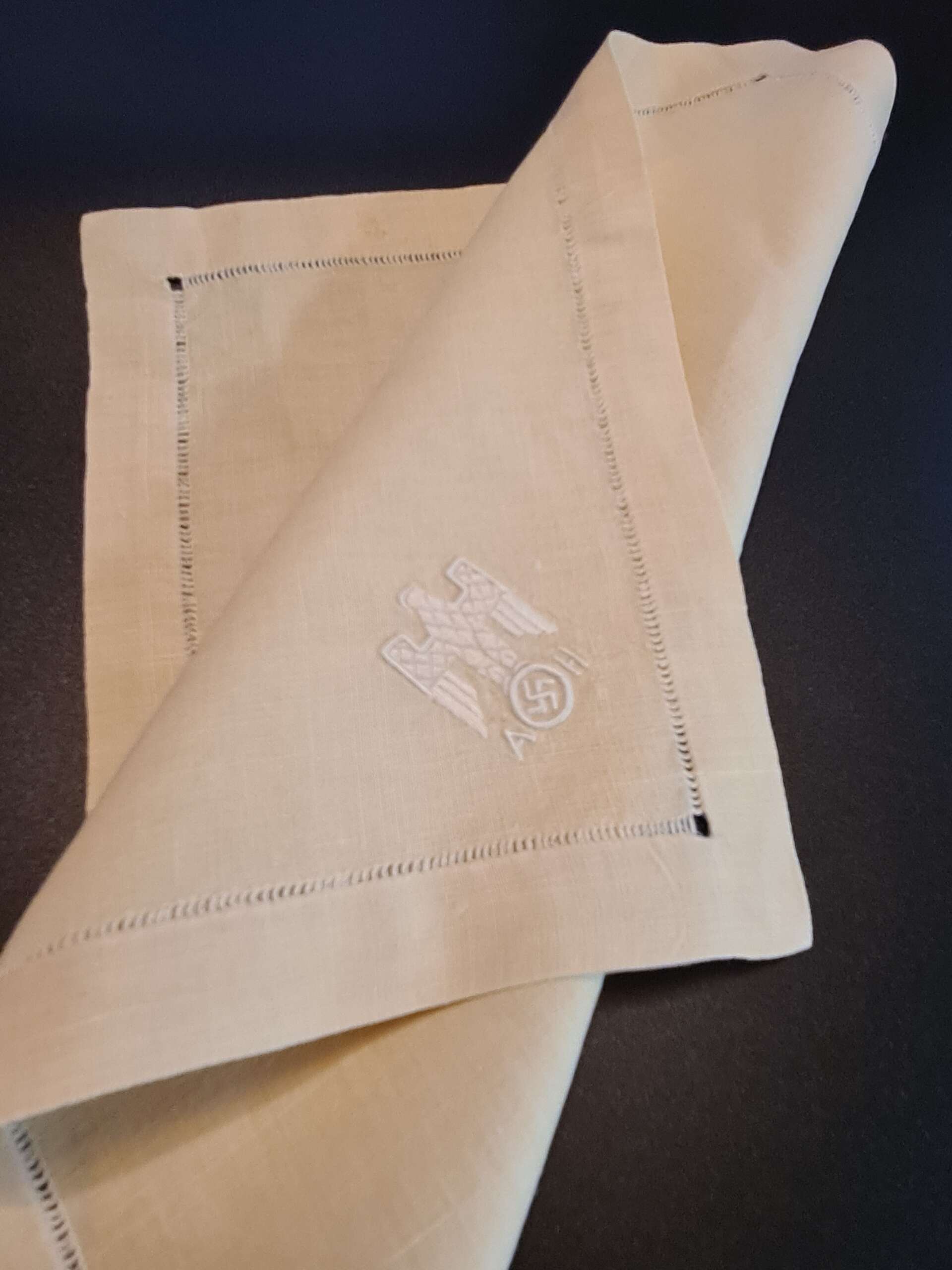 A rather lovely Adolf Hitler Informal napkin typically used for everyday use at breakfast, lunch & dinner when Hitler was present at various places he frequented the most; the ‘Berghof’ (Hitler’s mountain home), ‘Kehlsteinhaus’ (the Eagle’s Nest), the ‘Gasthaus’ (Guest House) at Obersalzberg, the ‘Braune Haus’ (the ‘Brown House’), his ‘Prinzregentenplaz’ apartment in Munich, and the ‘Reichskanzlei’ in Berlin, but especially at his mountain retreat in Obersalzberg, The Berghof.