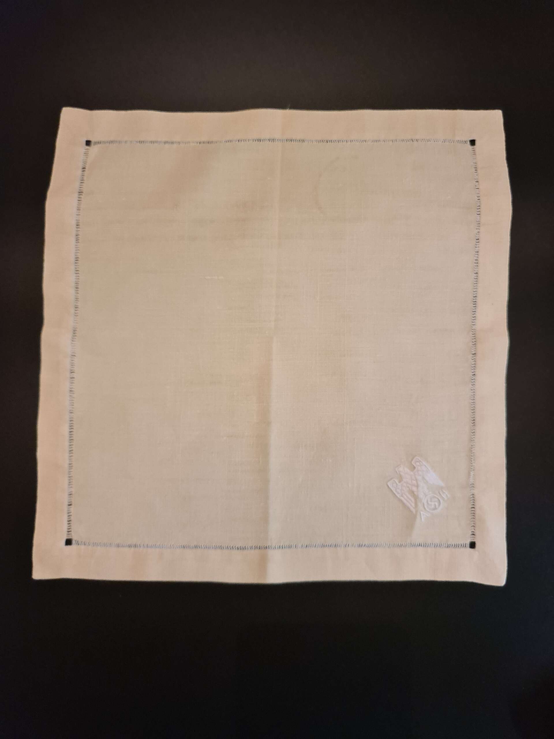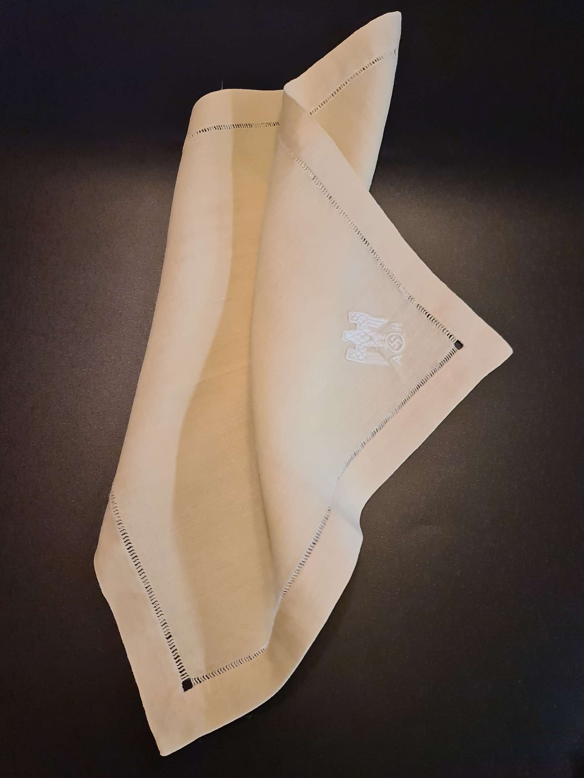 The napkin is in absolutely beautiful condition, has no rips or tears, and is very clean. There is a little crescent-shaped but very light stain remnant from a small glass or cup (period or not, unknown!), otherwise there are expected cloth creases due to folding which could be ironed out if so desired. The Fuehrer Adler looks spectacular.