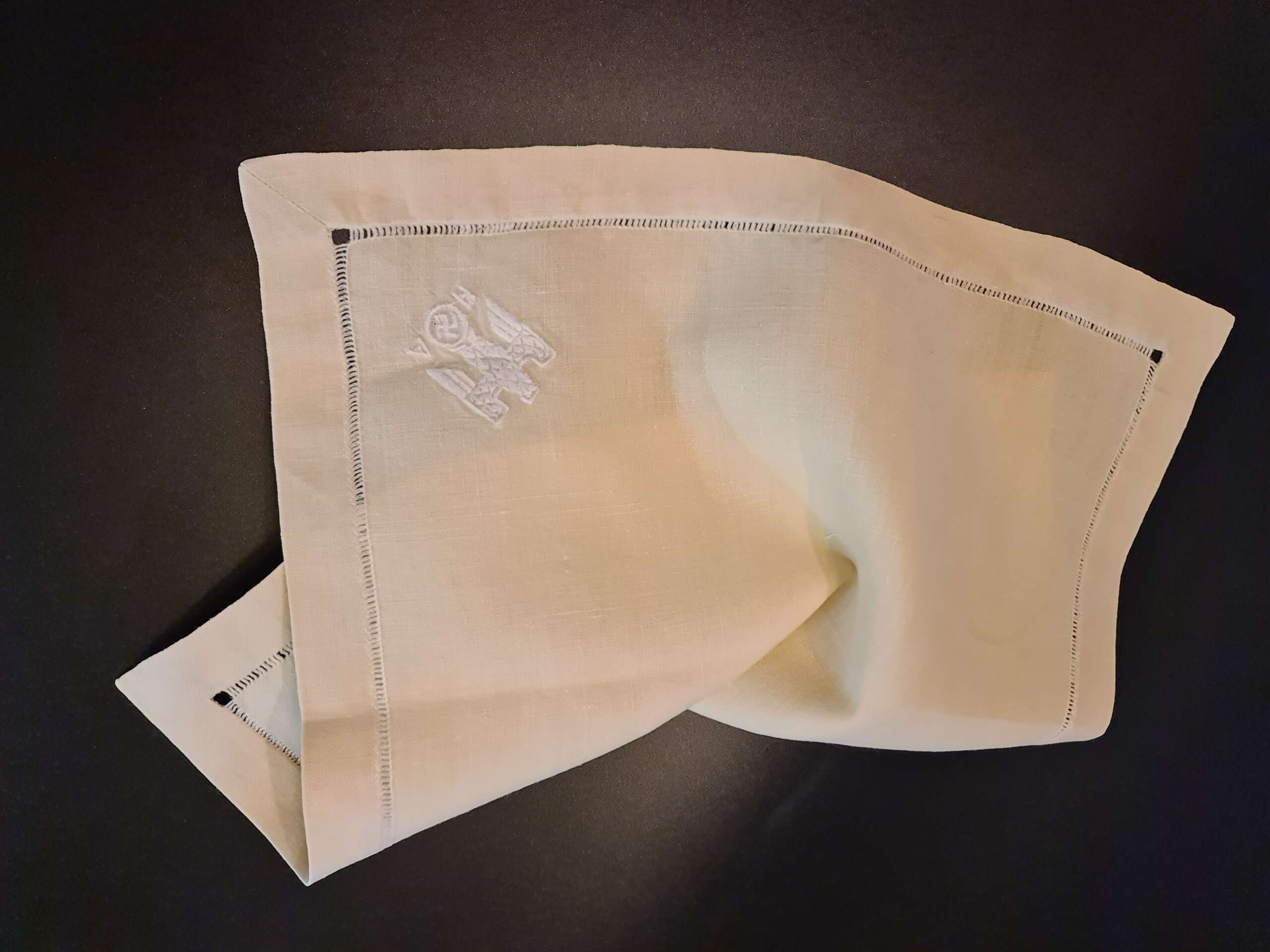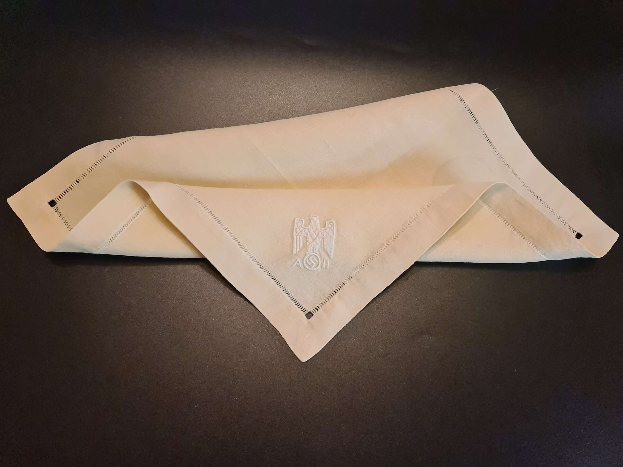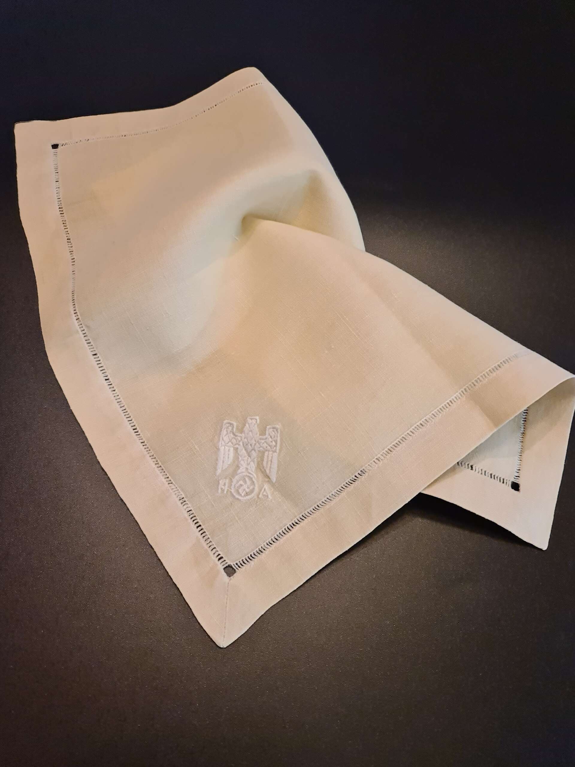 A rather lovely Adolf Hitler Informal napkin typically used for everyday use at breakfast, lunch & dinner when Hitler was present at various places he frequented the most; the ‘Berghof’ (Hitler’s mountain home), ‘Kehlsteinhaus’ (the Eagle’s Nest), the ‘Gasthaus’ (Guest House) at Obersalzberg, the ‘Braune Haus’ (the ‘Brown House’), his ‘Prinzregentenplaz’ apartment in Munich, and the ‘Reichskanzlei’ in Berlin, but especially at his mountain retreat in Obersalzberg, The Berghof.