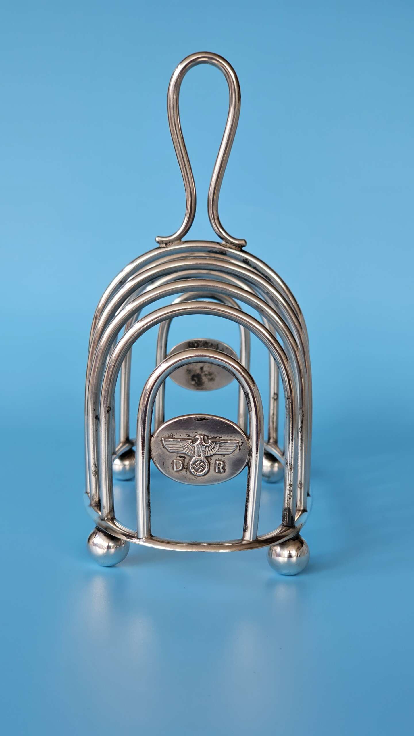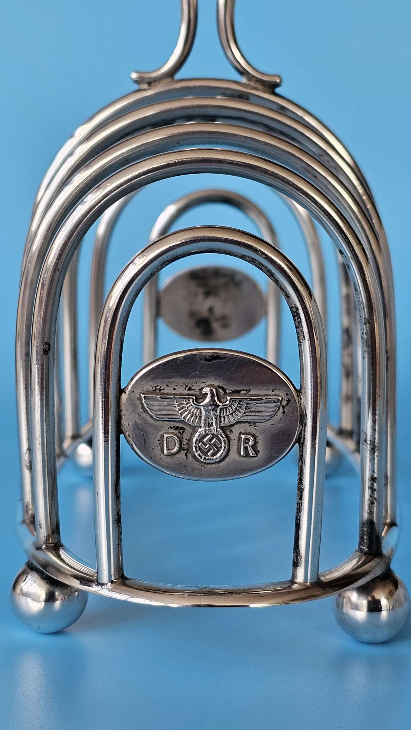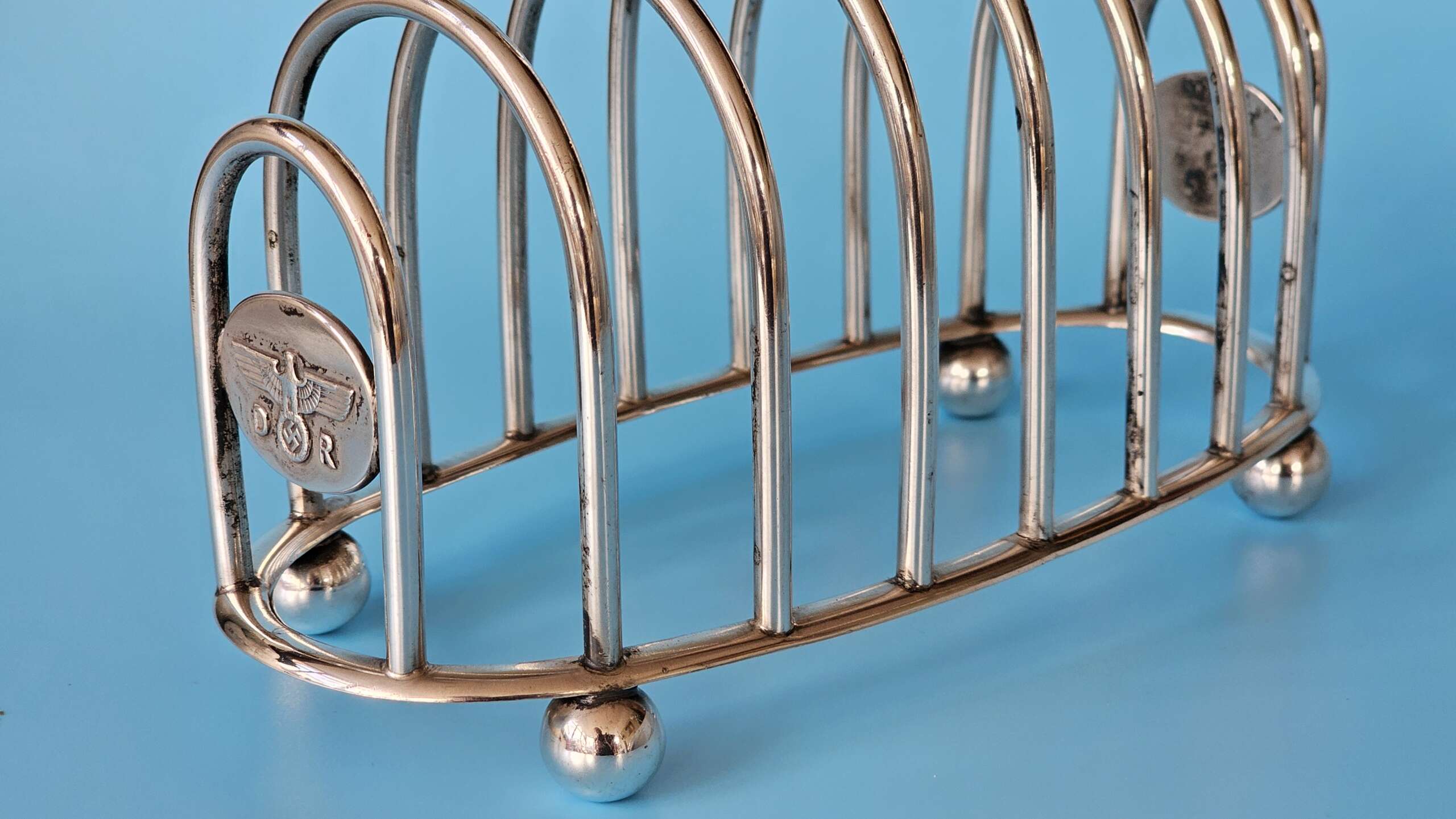 The main body of the rack has slots for eight slices of toast, with an elongated lifting handle situated on the centre ring, at each end of the rack is an oval plate, each of which features a finely detailed Deutsche Reichsbahn Eagle with wreathed Swastika straddled by the letters D and R all in relief. There are four ‘ball’ feet to the base, and stamped into the base rim is found the Bruckmann ‘train’ makers mark, the German silver alloy mark ‘ALPAKA’, followed by the impressed number ‘241’ indicating the wagon number.