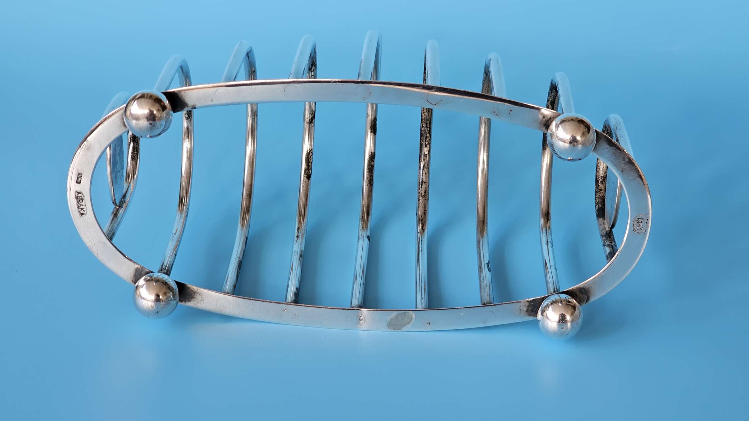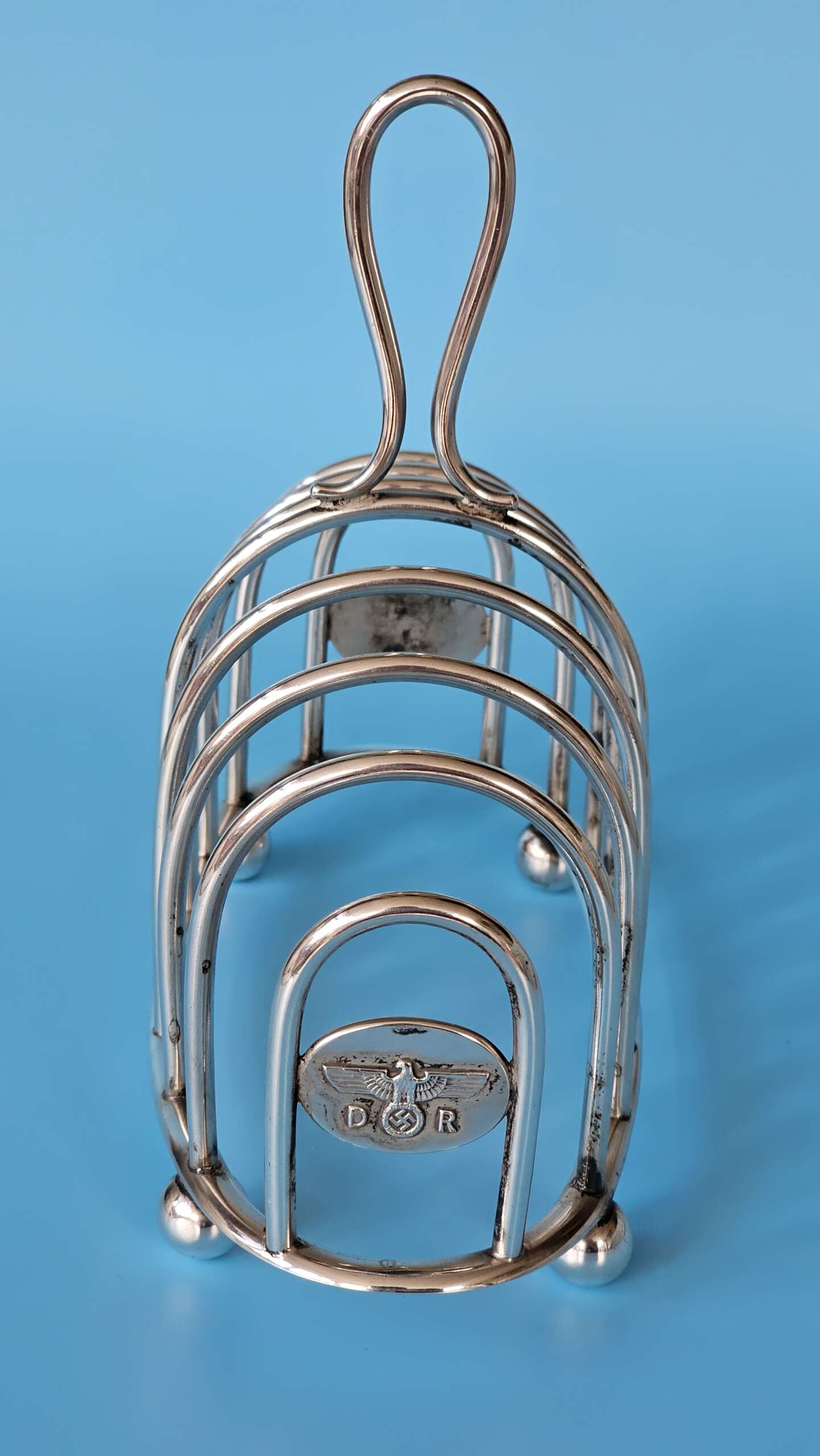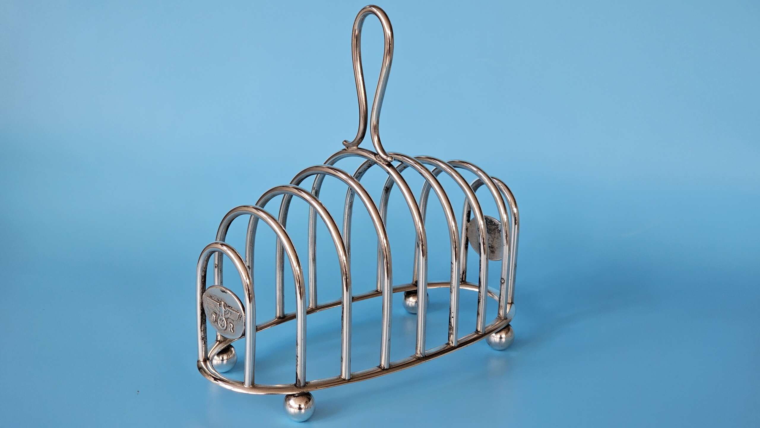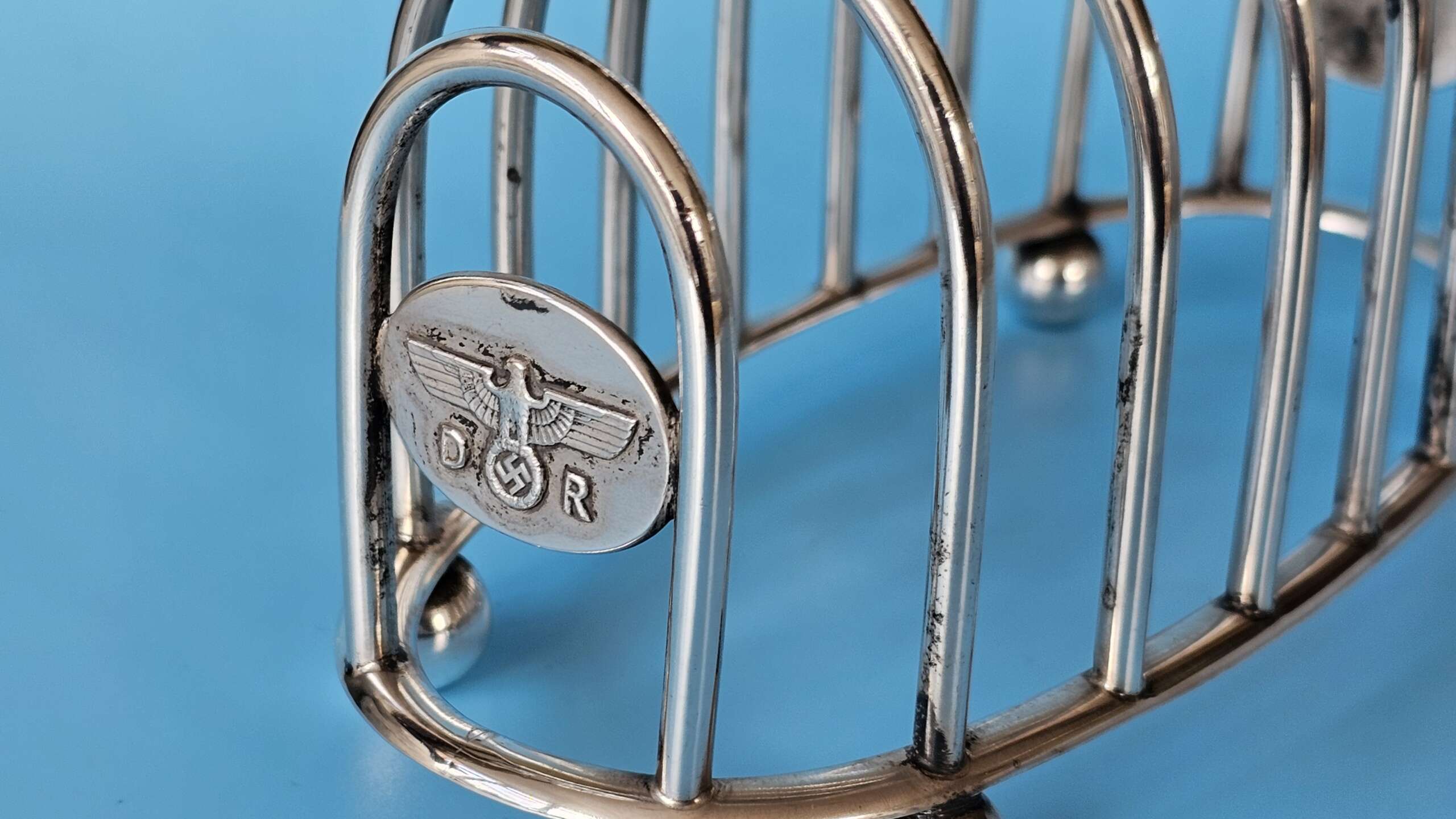 The main body of the rack has slots for eight slices of toast, with an elongated lifting handle situated on the centre ring, at each end of the rack is an oval plate, each of which features a finely detailed Deutsche Reichsbahn Eagle with wreathed Swastika straddled by the letters D and R all in relief. There are four ‘ball’ feet to the base, and stamped into the base rim is found the Bruckmann ‘train’ makers mark, the German silver alloy mark ‘ALPAKA’, followed by the impressed number ‘241’ indicating the wagon number.