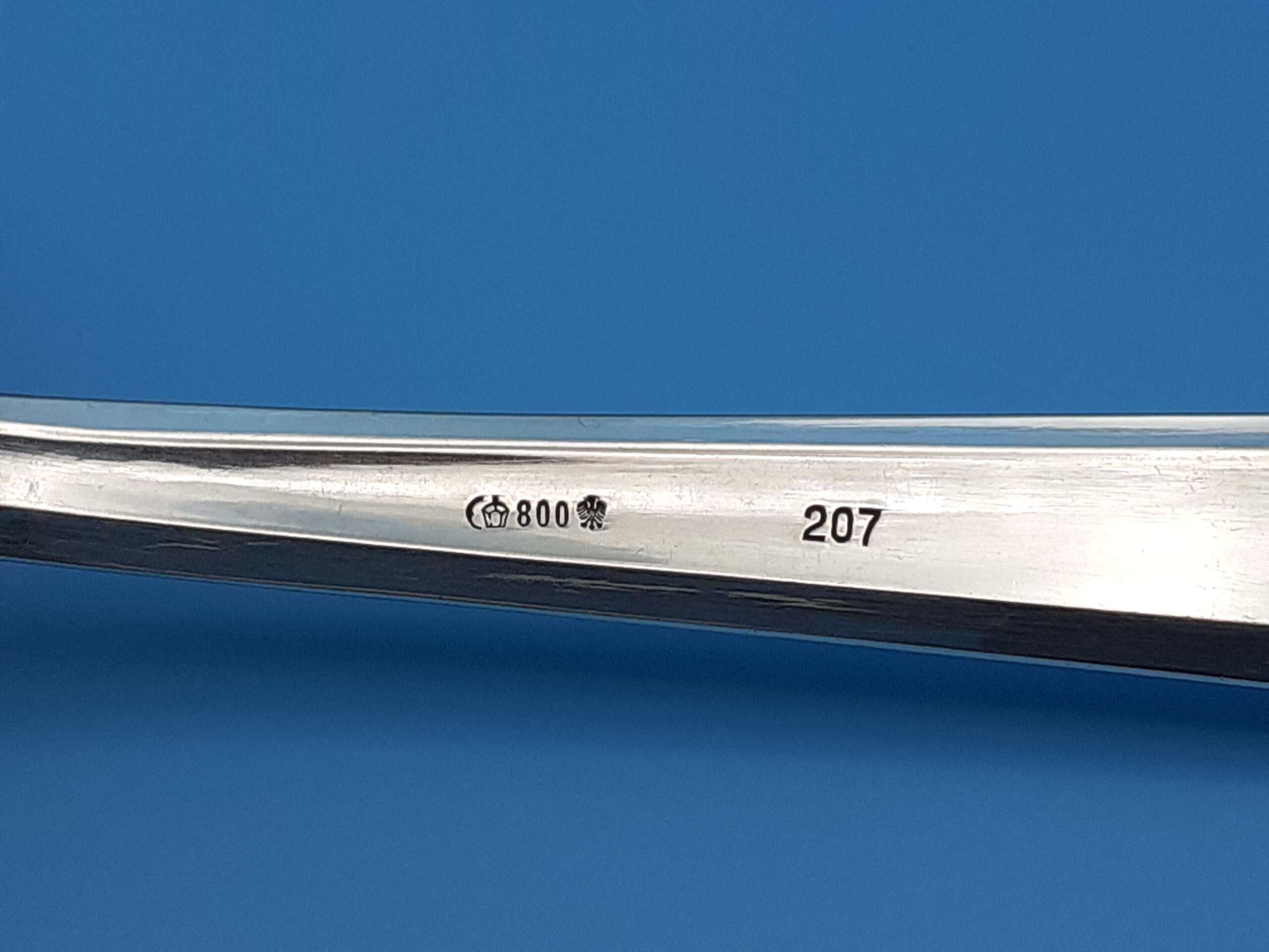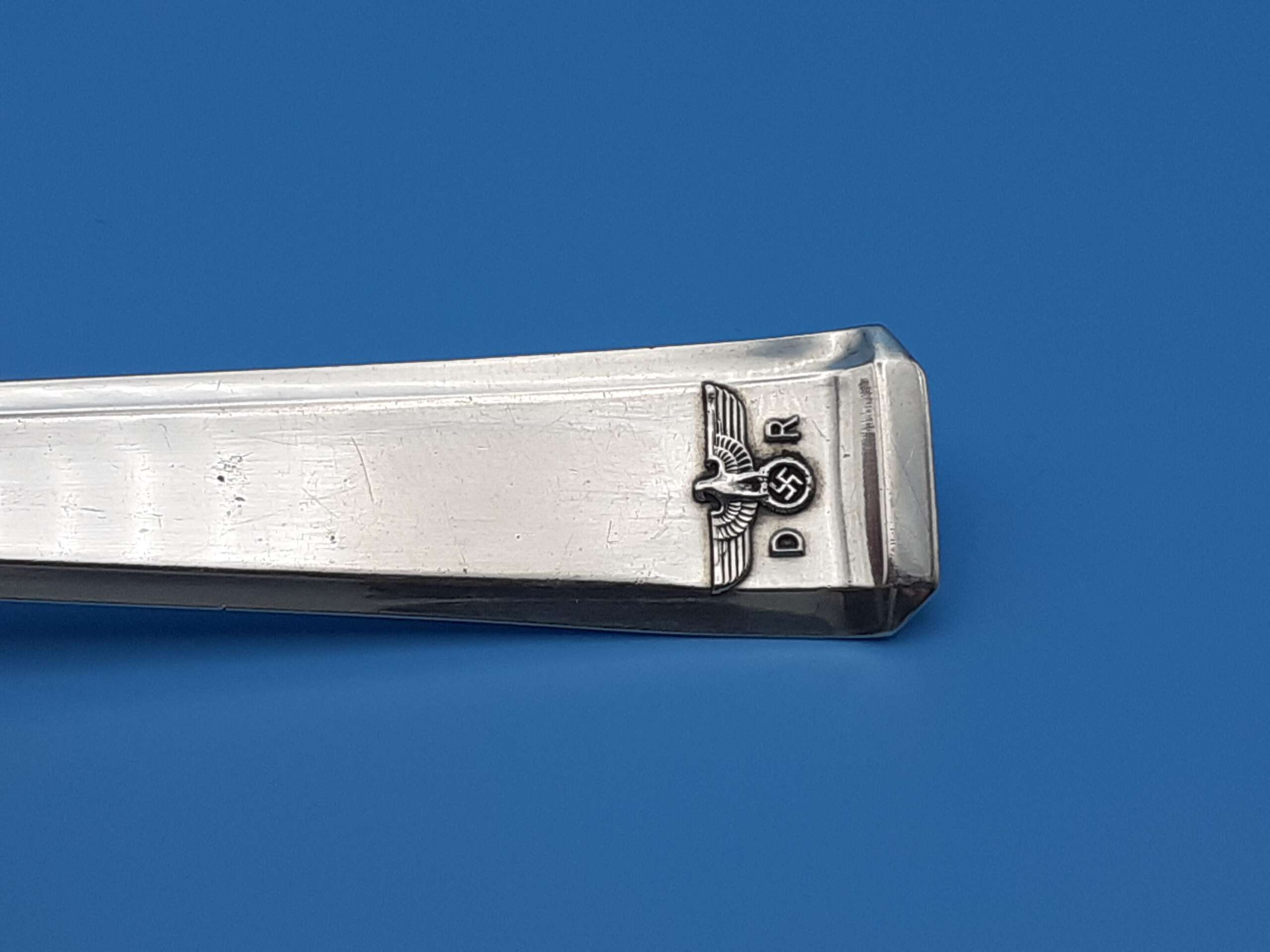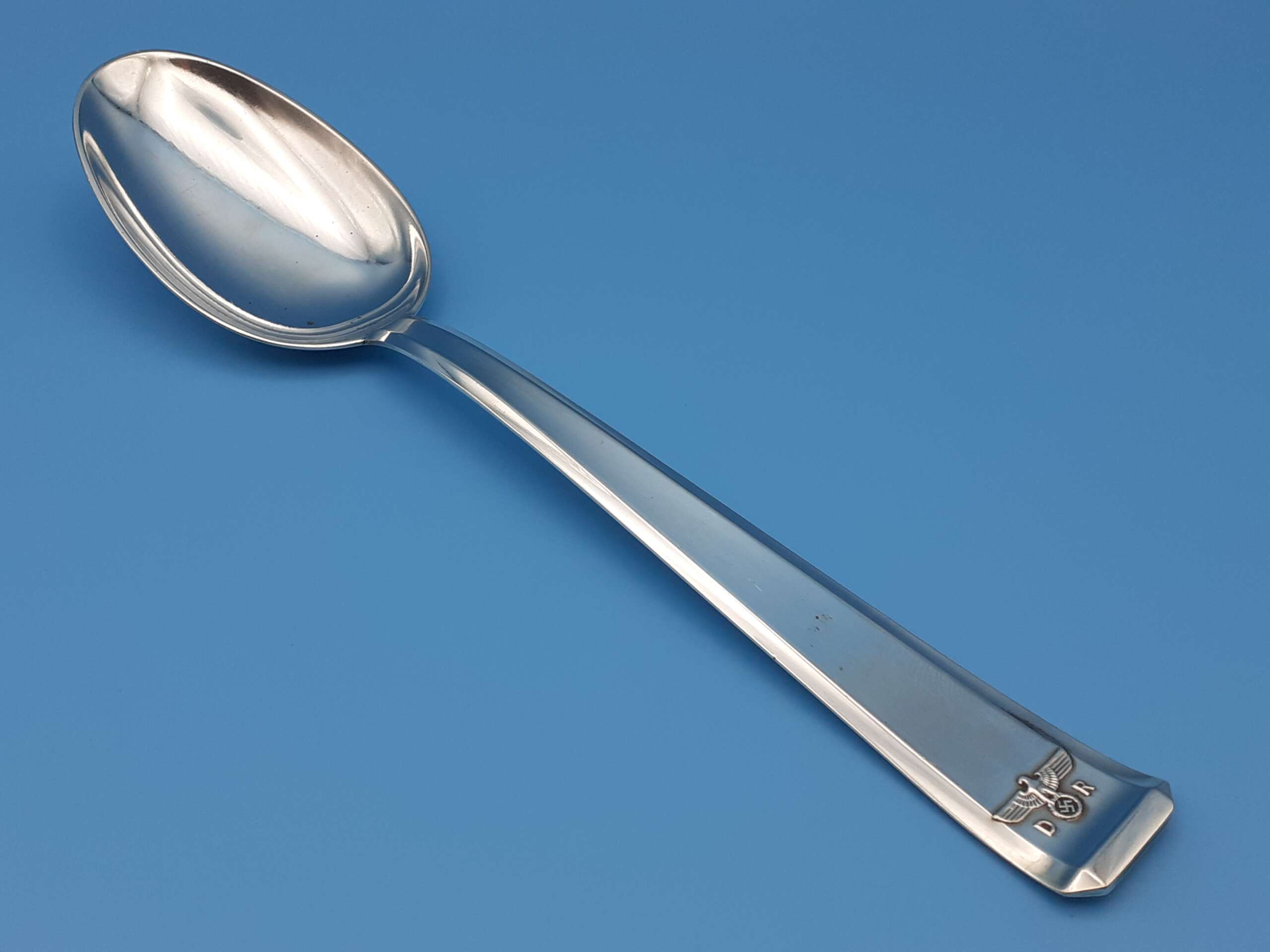 The spoon handle has a tapered edge to obverse and reverse, and a resting flat on the reverse high point. The obverse features a finely detailed Deutsche Reichsbahn Eagle with wreathed Swastika straddled by the letters D and R all in relief to the bottom of the handle. To the reverse is found the stamped Bruckmann & Sohne ‘RM800 Eagle and Crown’ (indicating 800 silver content) makers mark, and then the impressed number ‘207’ indicating the wagon number.