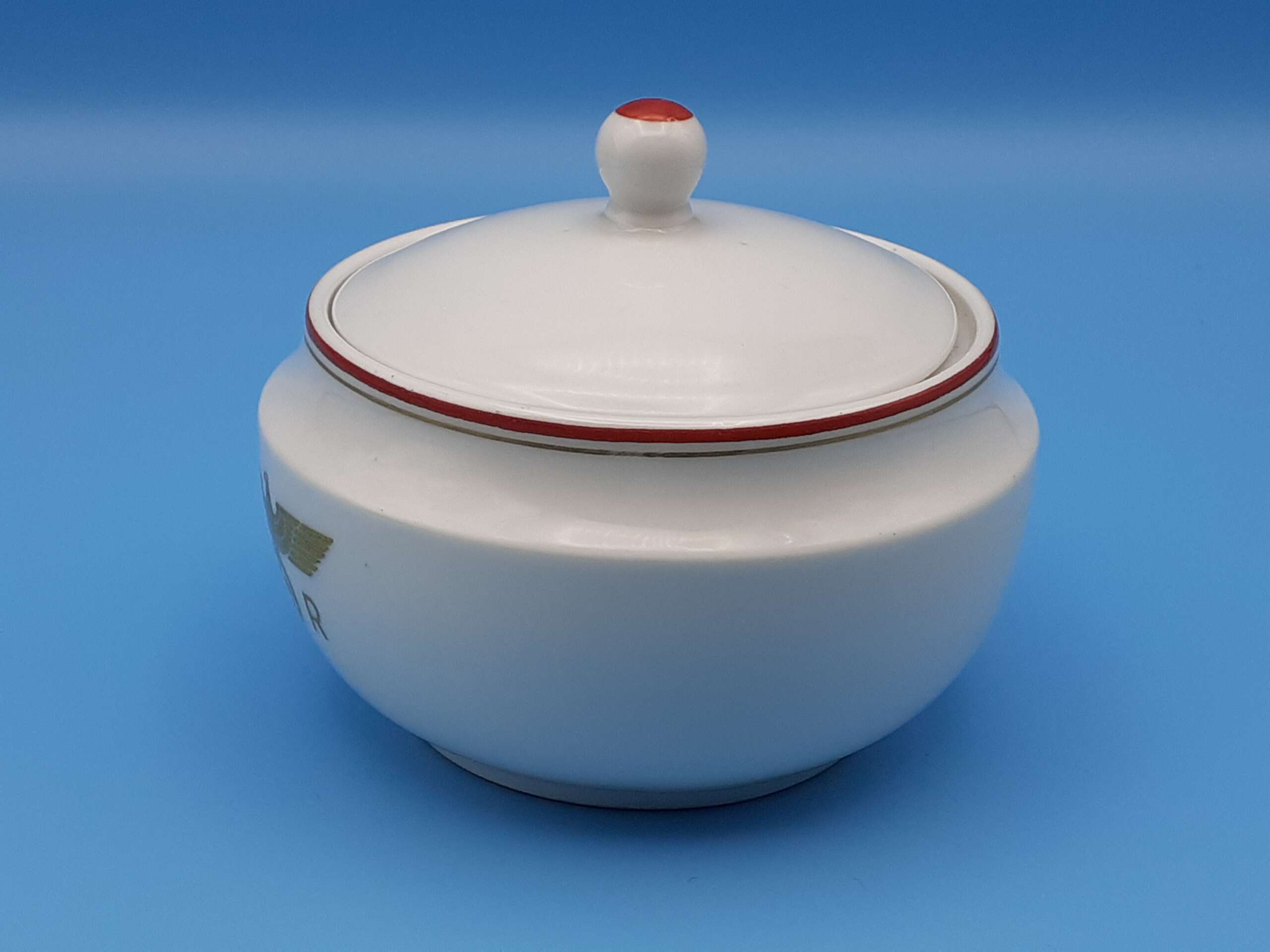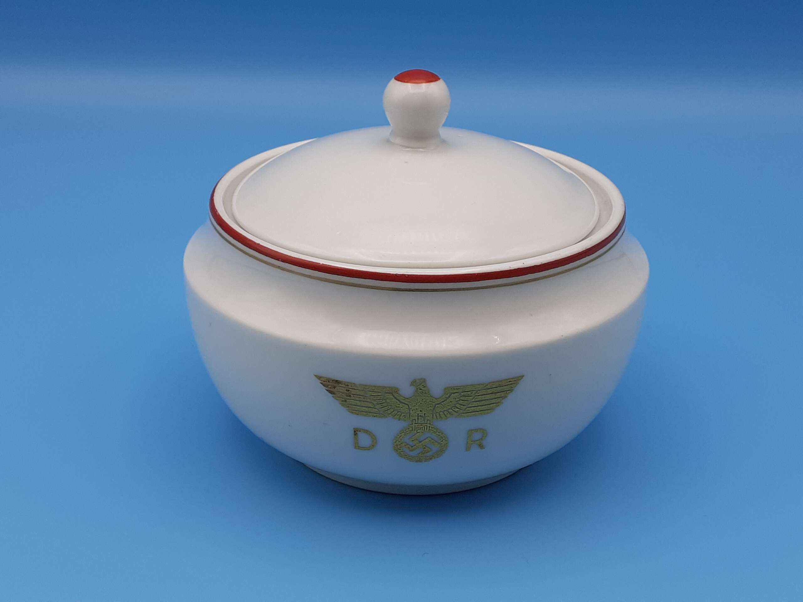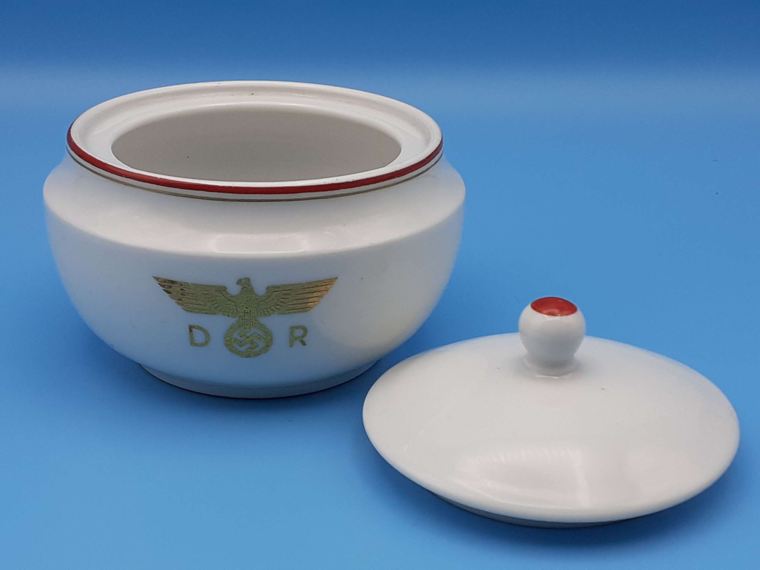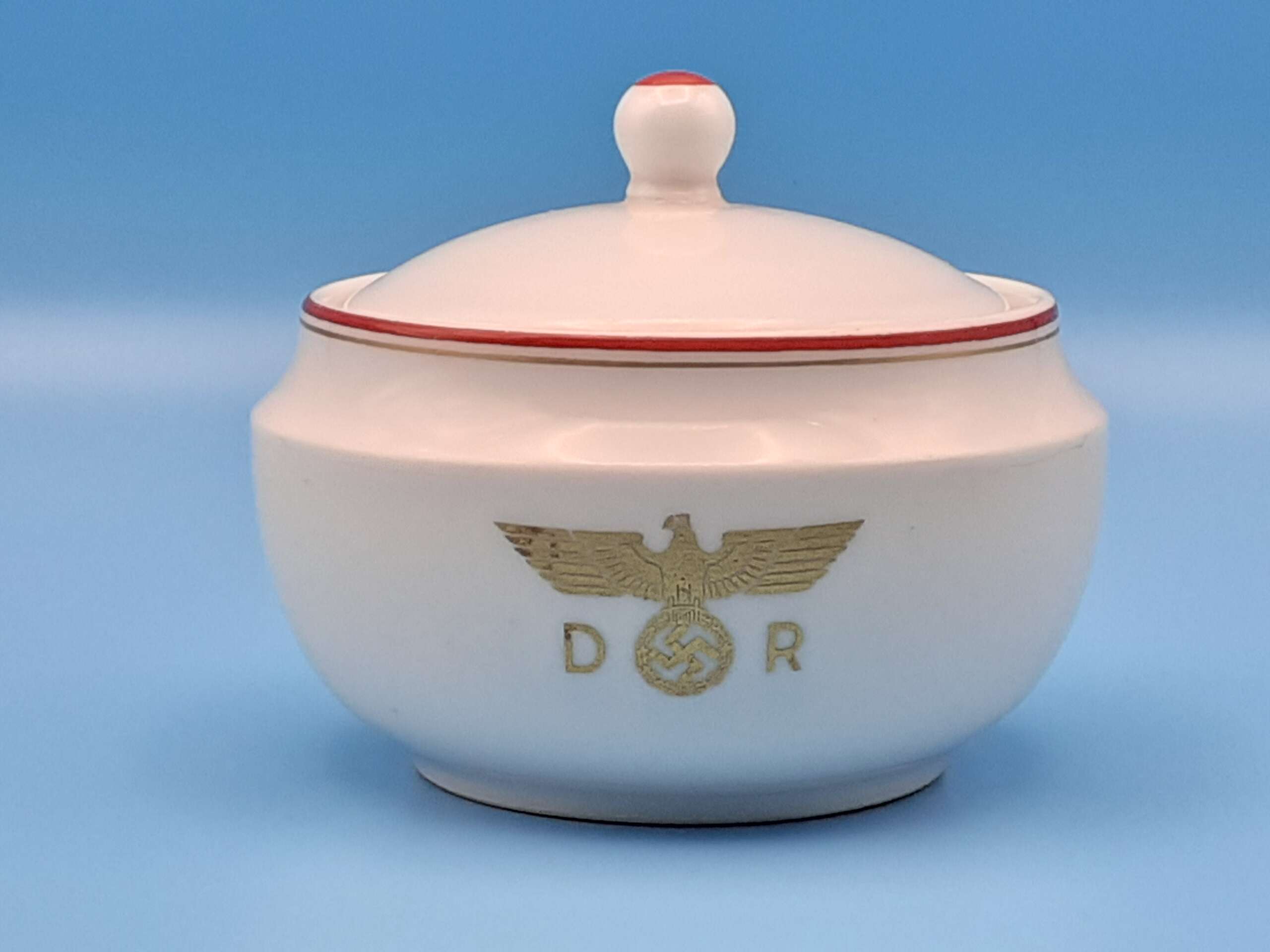 The highly glazed porcelain is accentuated with a fine red trim and even finer gold trim to the top rim. Centered to the main body of the bowl is the Deutsche Reichsbahn insignia, a gold eagle with wreathed swastika straddled by the letters D and R. To the underside is found the green Nymphenburg crest, an impressed Nymphenburg shield, production numbers; ‘124’, ‘1 1/2’, and a hand-painted number ‘234’ in black indicating the wagon number. The lid lifter has a red top.
